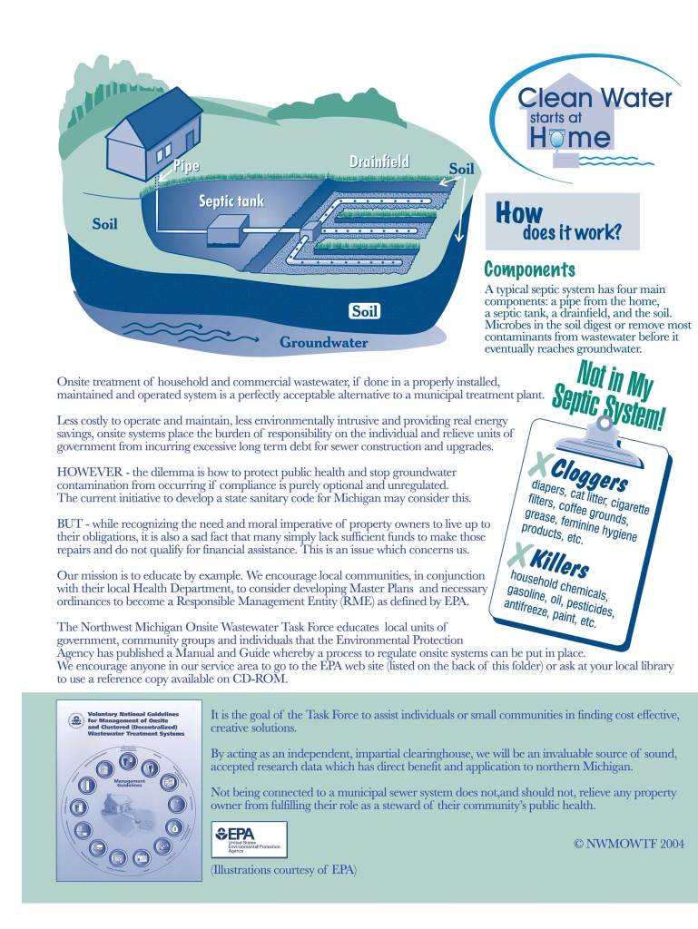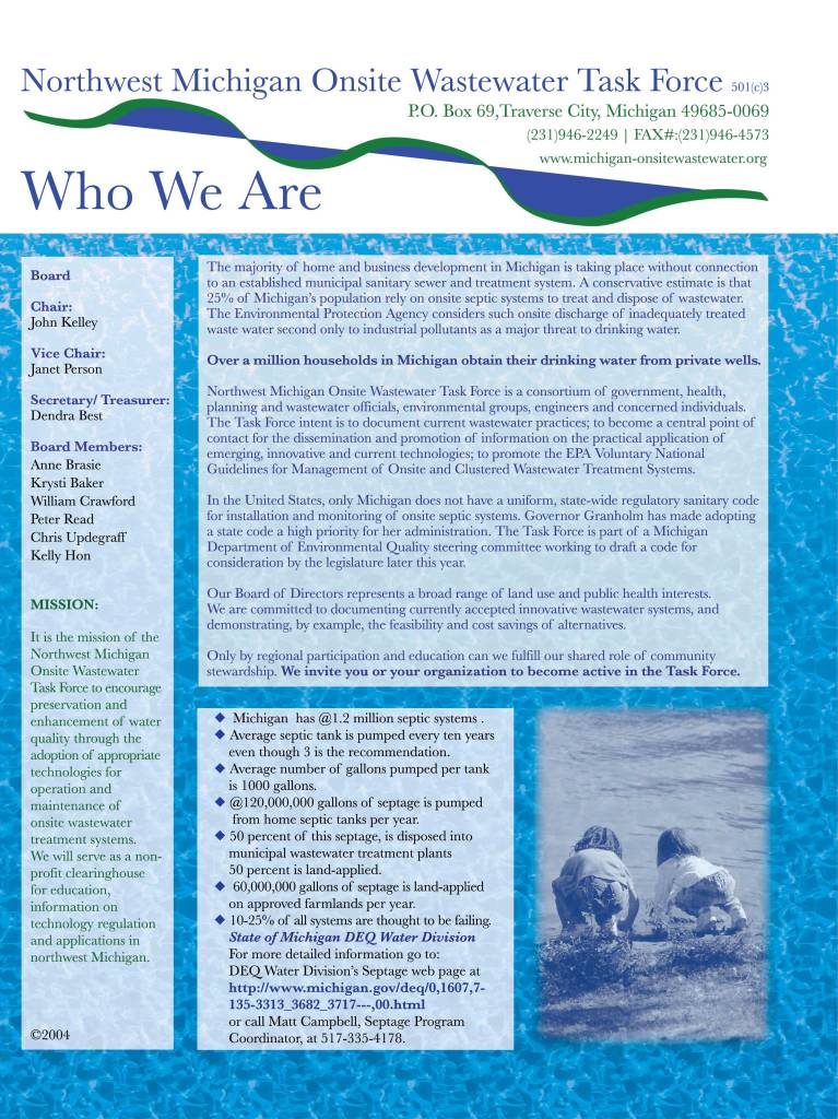 “It is the Mission of the NWMOWTF to act as a regional clearing house for information, education and advocacy for viable, technologically sound and proven onsite wastewater systems that go beyond the standard septic and drain field.