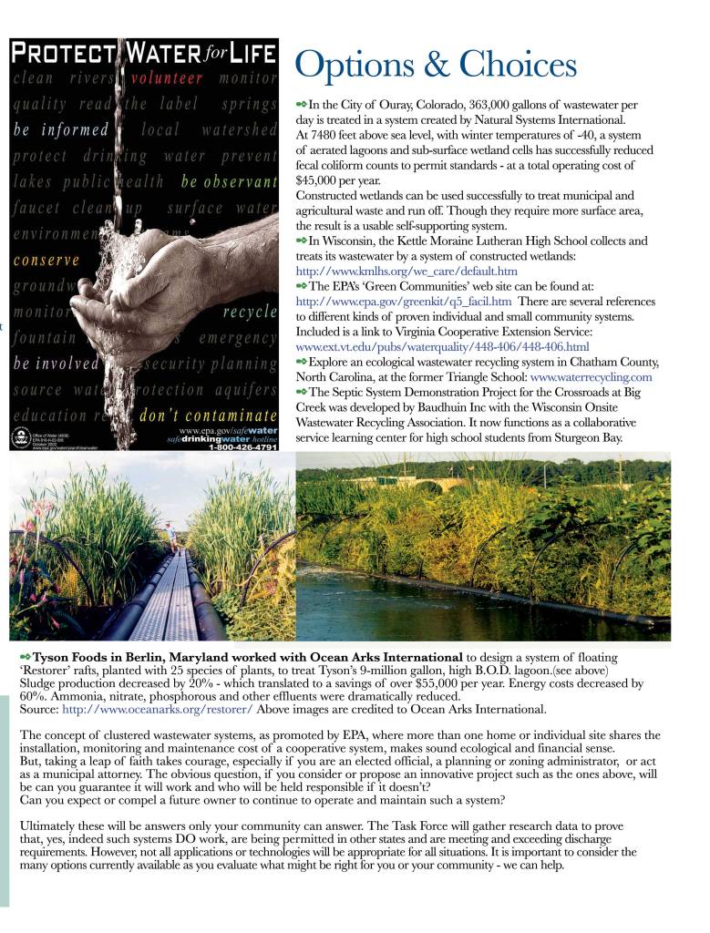 The Task Force accomplishes itʼs Mission by 2 actions: public education and identifying demonstration sites. We build regional networks and partnerships through public education and outreach. We bring information directly to elected and appointed local government officials and also to their constituents via their local community organizations. We offer working demonstrations of available proven onsite wastewater treatment technologies and advocate the clustered decentralized management models as published by US Environmental Protection Agency.